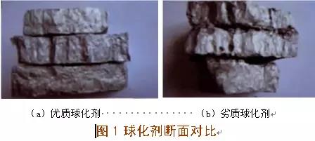 觀察球化劑斷口, 可以直觀分辨球化劑的優(yōu)劣。優(yōu)質(zhì)球化劑色灰蘭略黃,斷口組織致密,斷口呈金屬光澤(見(jiàn)圖1a),劣質(zhì)球化劑斷面致密性差,有氣縮孔、夾渣等異物,斷面灰暗(見(jiàn)圖1b)。